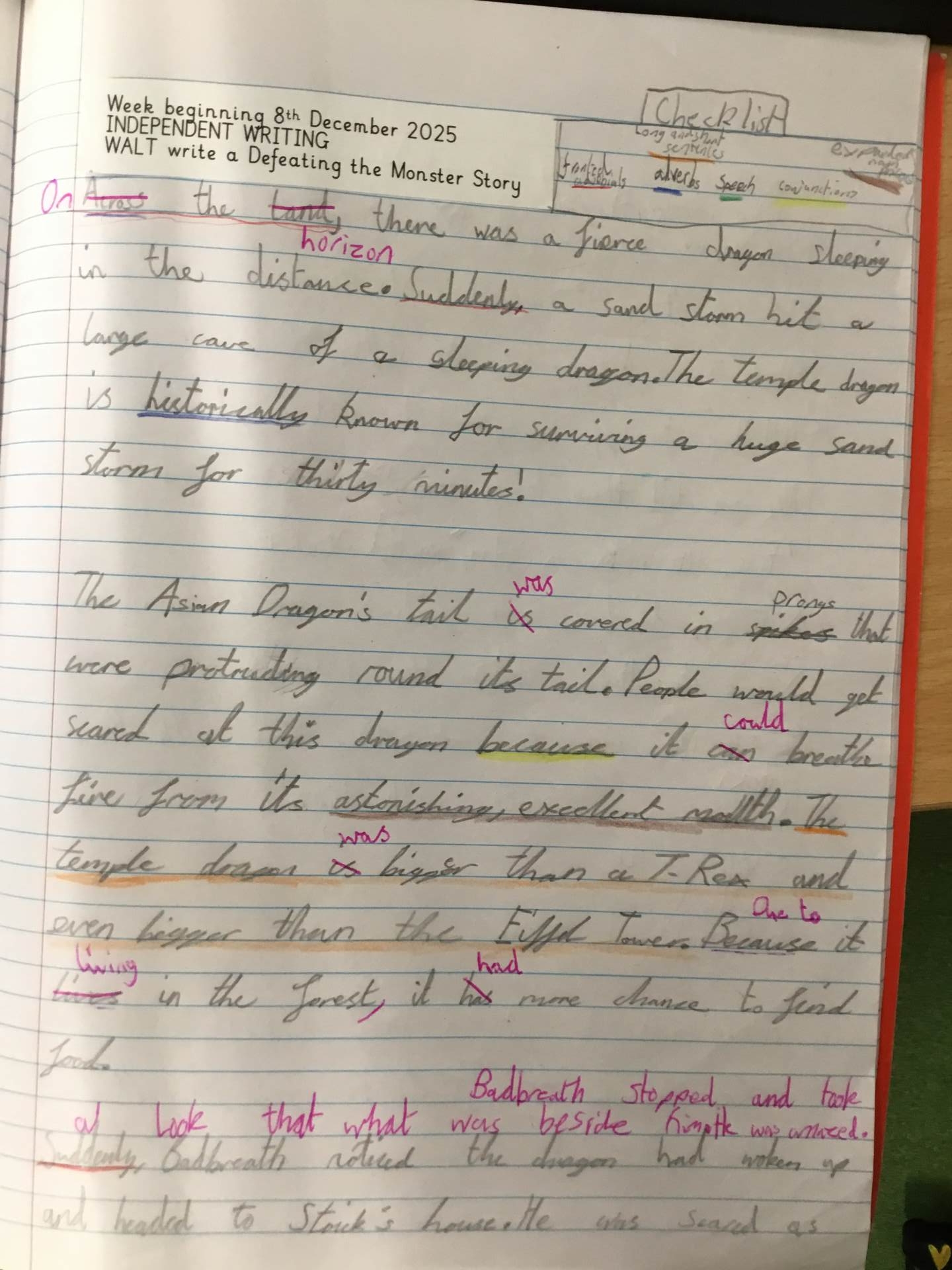 Through modelled texts, children are shown the grammar to be taught in context. Children will identify the grammar, before explicit grammar lessons teach the skill. Children will apply this knowledge through ‘short burst writing'. Dictation sentences provide children the opportunity to practise the grammar skills in a variety of different sentences.